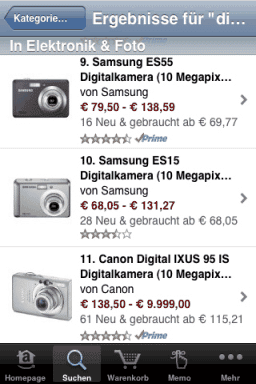 Durch die Amazon Mobil App haben Sie vollen Zugriff auf den Amazon.de Online Shop. Einfach und schnell Produkte suchen, einkaufen, Preise vergleichen und Rezensionen lesen – alles mit einem einfachen und eleganten Interface. Seit neustem bietet die App ebenfalls eine neue Funktion mit der über Amazon Memo, ein Foto von einem gewünschten Artikel gemacht werden kann, dieser auf Amazon.de gesucht wird und falls er gefunden worden ist, der Kunde eine eMail mit dem Resultat (Preis, Bewertung, Beschreibung) zugeschickt bekommt.