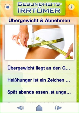 „Lange schlafen ist Gesund, Sport stärkt das Immunsystem, Vitamin C beugt Erkältungen vor, Fasten entschlackt, Rotwein ist gesund.” – Die App Gesundheits-Irrtümer nimmt 111 der spannendsten Irrtümer aus 9 verschiedenen Themenbereich unter die Lupe und deckt auf, was wirklich stimmt und was nicht.