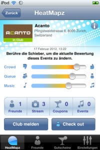 Bist du im Club oder in der Bar angekommen, muss du nur noch über die App. „einchecken“ und eine Bewertung über die Schiebregler abgeben. Wenn du HeatMapz mit deinem Facebook Account verknüpft hast, können deine ganzen Freunde auch direkt sehen, wo du gerade am „abfeiern“ bist.