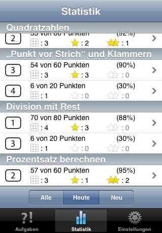 Zudem bietet dir die App weitere Features, wie zum Beispiel das gezielte Üben von bestimmten Einmaleinsaufgaben oder Aufgaben zu Punkt-vor-Strich- und Klammerungsregeln. Desweiteren hast du die Möglichkeit dir ein Statistik anzeigen zu lassen.