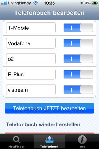 Eine super Applikation für iPhonebesitzer mit einer Handy- oder SMS-Flatrate in nur bestimmte Mobilfunknetze, die Ihre Kosten durch telefonieren und SMS schreiben in fremde Netze minimieren wollen. Auch für iPod Touch User kann Netzfinder nützlich sein, denn durch das eingeben beliebiger Handynummern, kann man die App super als Ergänzung zum normalen Handy nutzen. Zu Beachten ist aber das man eine aktive Internetverbindung benötigt. Ansonsten besteht keine Möglichkeit, das man die Handynummer überprüfen lassen kann.