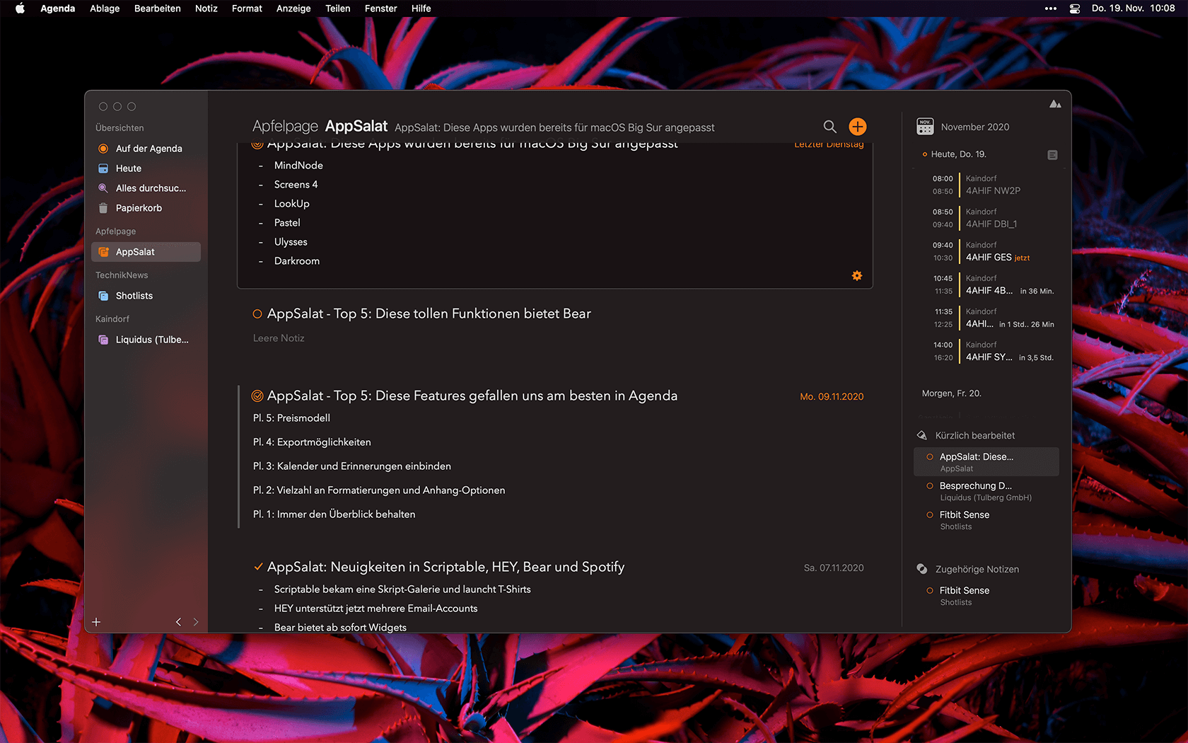 Am Ende kann man jedoch getrost resümieren, dass regelmäßige „Notizen-Schreiber“ Agenda einmal ausprobieren sollten. Gerade, wenn einem die derzeit verwendete Notizen-App zu einfach gestrickt ist. Agenda macht den anspruchsvolleren Nutzer produktiver und den Workflow effizienter. Und darum geht es am Ende doch, oder?