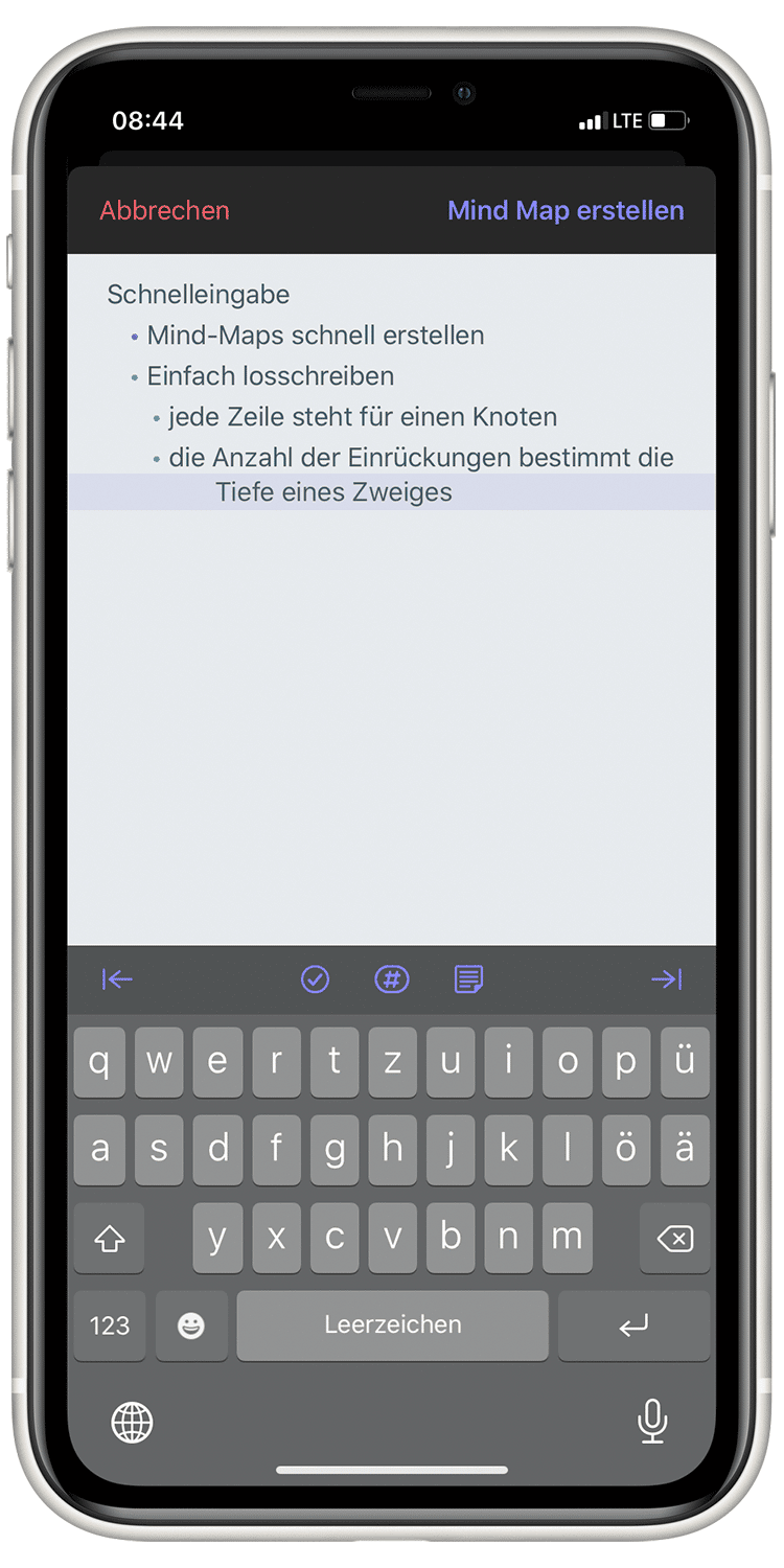 Das Schnelleingabe-Feature funktioniert gleich wie die ersten beiden erwähnten Kurzbefehl-Aktionen. Jede Zeile steht also für einen Knoten, und die Anzahl der Einrückungen bestimmt die Tiefe des Knotens. Optional kann man hier aber Aufgaben, Tags und Notizen anfügen. Danach kann dieses Geschreibsel in eine Mind-Map konvertiert werden.