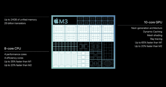Der neue M3 kommt mit acht CPUs, vier auf Effizienz, vier auf Performance getrimmt, er ist laut Apple 65% schneller als der M1. Der M3 adressiert weiterhin maximal 24 GB gemeinsamen Speicher und besitzt 25 Milliarden Transistoren. Er ist immerhin 20% fixer als der Vorgänger und bis zu 35% schneller als der M1.
