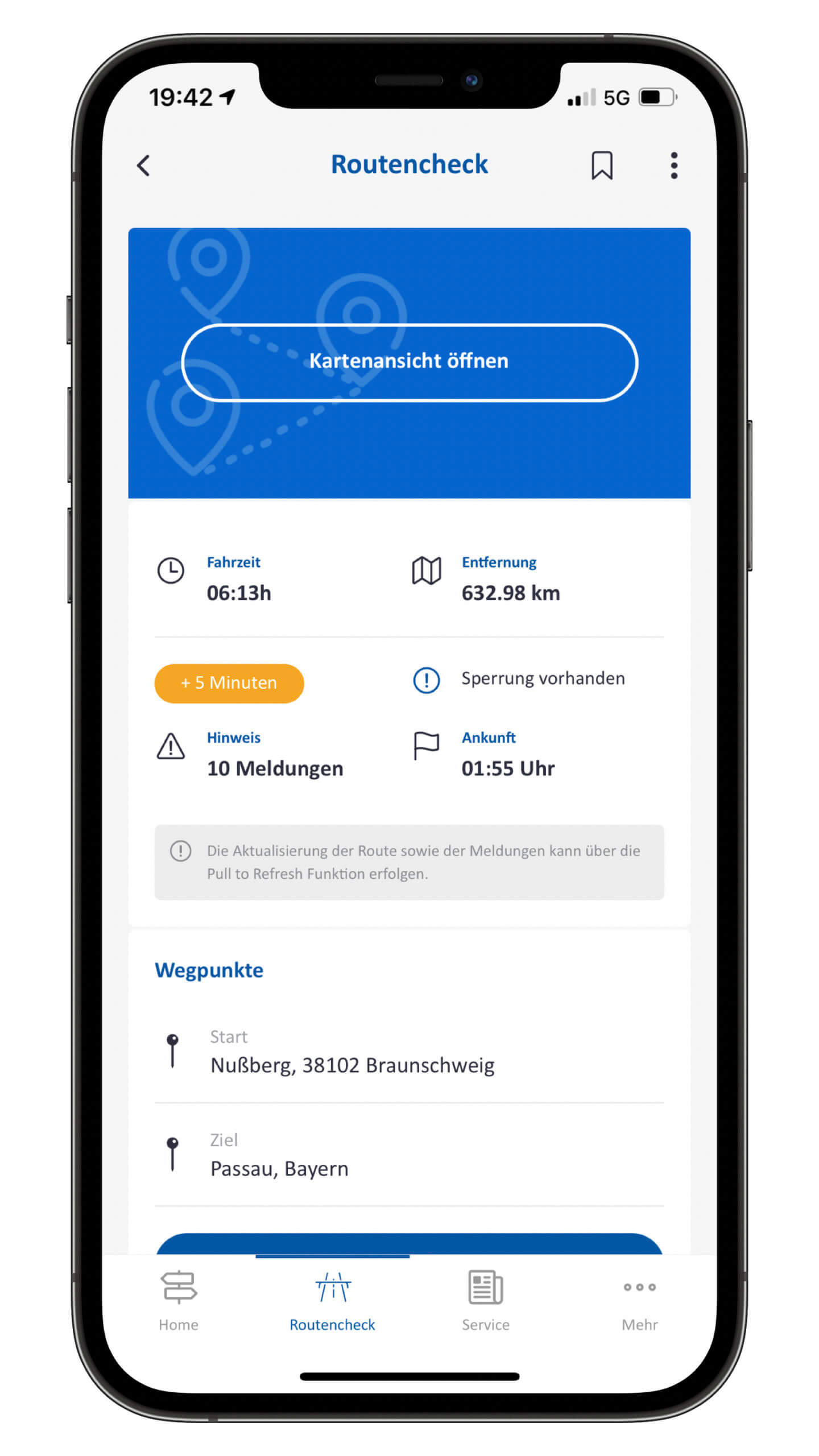 Man kann darüber seine komplette Navigation laufen lassen, dabei bekommt man nach Eingabe von Start- und Zielpunkt nicht nur die komplette Route angezeigt, es werden auch gleiche alle aktuellen Warnmeldungen inkludiert und in die Routenzeit mit eingerechnet. Interessant dabei: Zu allen Hindernissen sind weiterführende Detail-Informationen verfügbar, die etwa darüber aufklären, wann die Baustelle wieder verschwunden sein wird.