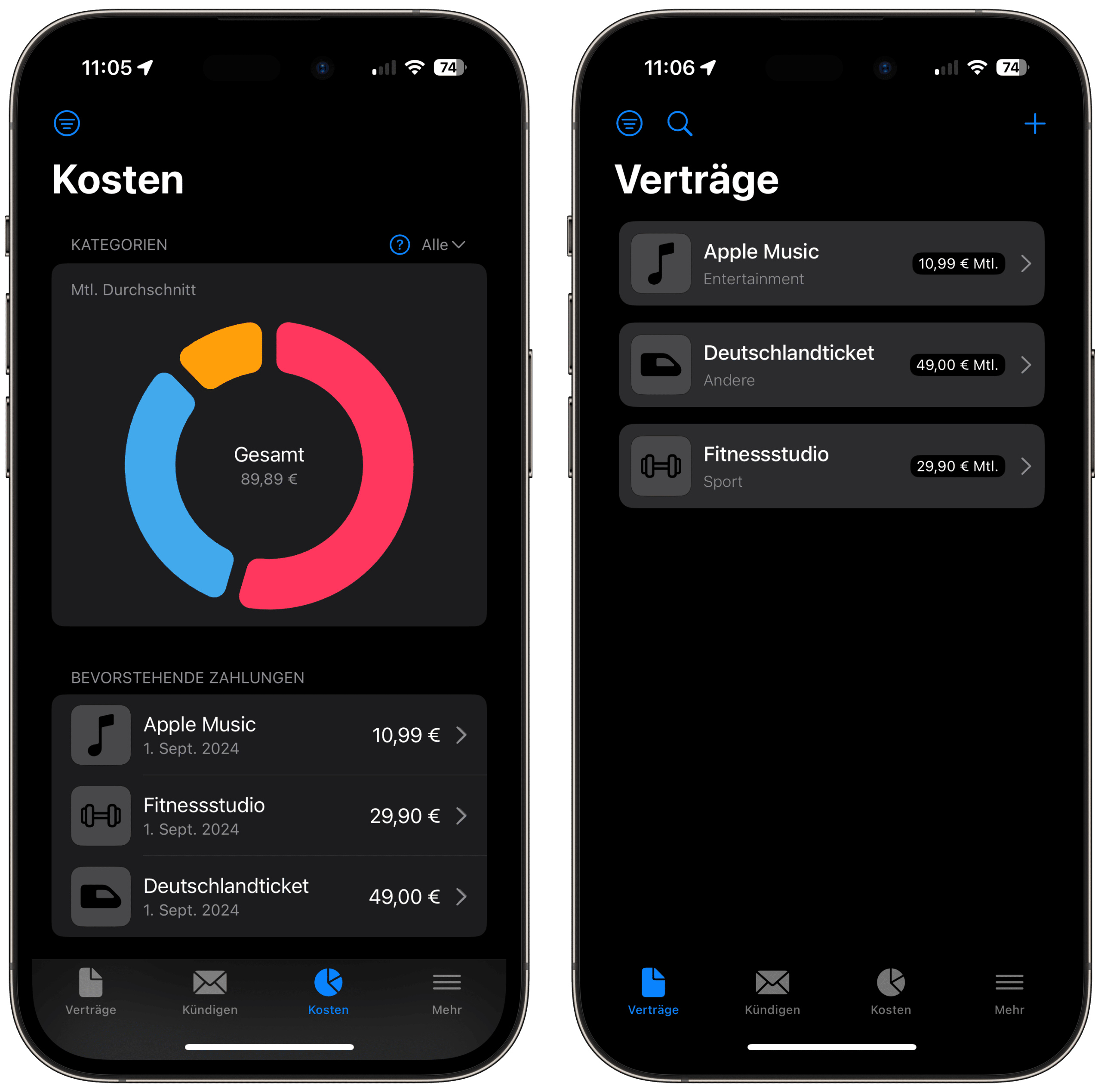 Die Übersicht über alle Verträge und Kosten ist einfach und mit schönen Details versehen.In unserem Test hat uns die kostenfreie Basisversion überzeugt. Das übersichtliche Layout, die detaillierten Beschreibungen sowie ein an die Systemeinstellungen gekoppelter Dark Mode zeigen, wie viel Liebe in diese Anwendung geflossen ist. Wer mit den Grundfunktionen nicht auskommt, zahlt je nach Gusto monatlich 0,99 Euro oder einmalig 17,99 Euro für die Vollversion. Aktuell ist der Einmalkauf um 44 Prozent auf 9,99 Euro reduziert.