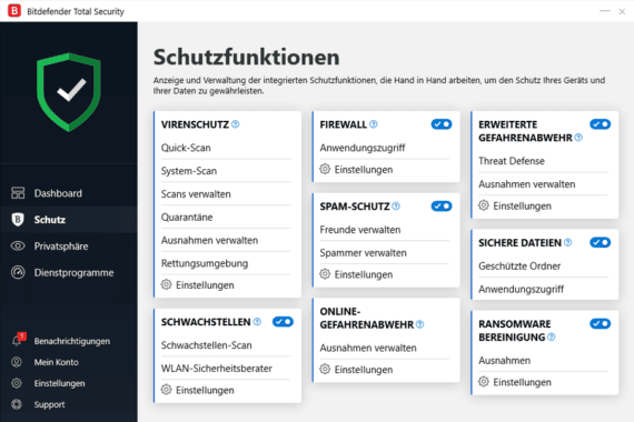 Bitdefender bewirbt Total Security auf der offiziellen Seite unter anderem mit diesen Kernfunktionen: