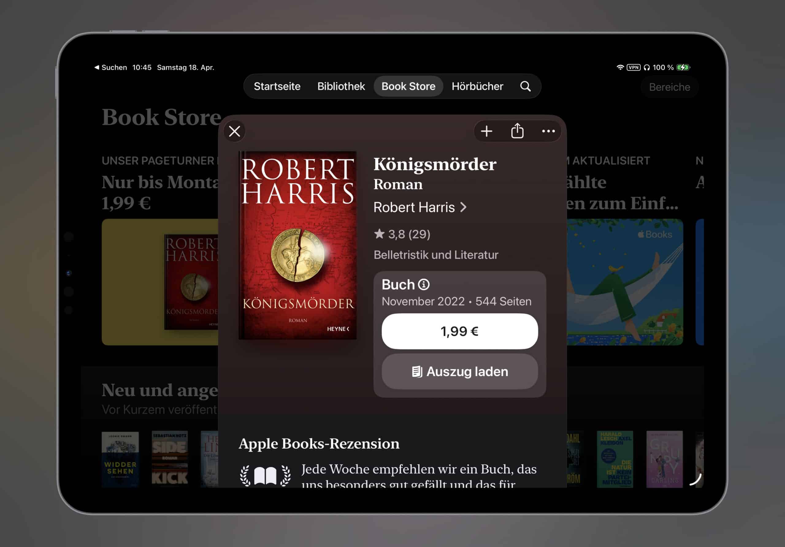 Als Pageturner gibt es dieses E-Book dieses Wochenende zu einem Sonderpreis von 1,99 € zu erwerben. Nach dem Kauf kann der Pageturner in der Bücher-App von Apple geräteübergreifend gelesen werden, eine automatische Synchronisation ist ebenfalls mit an Bord. Die hilft euch, bei der zuletzt gelesenen Stelle auf einem anderen Gerät weiterzulesen. Wir wünschen viel Vergnügen mit dem Lesestoff.