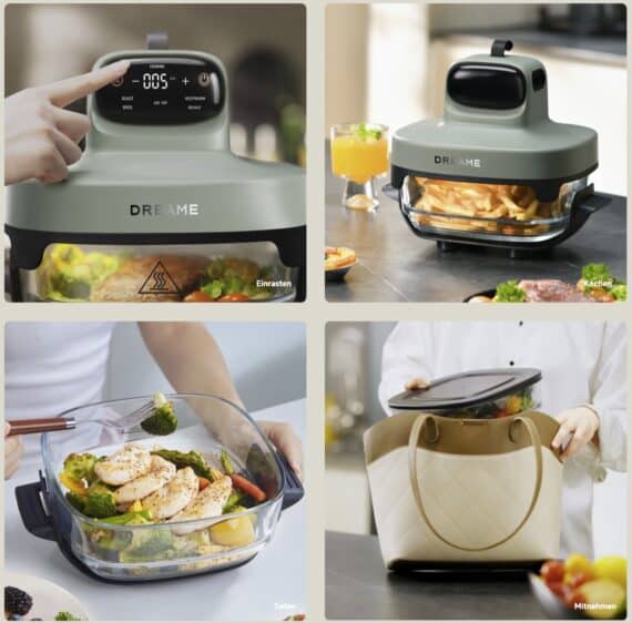 Heißluftfritteusen, auch als Airfryer bezeichnet, gehörten in den vergangenen Jahren zu den beliebtesten Haushaltsgeräten. Davon möchte auch Dreame partizipieren und hat sich ein paar nette Extras einfallen lassen. Neben der Heißluftfritteuse kann es auch zum Aufwärmen, Dämpfen oder Warmhalten genutzt werden. Die Zubereitung erfolgt in einem hitzebeständigen Glasbehälter, welcher zudem spülmaschinenfest ist.