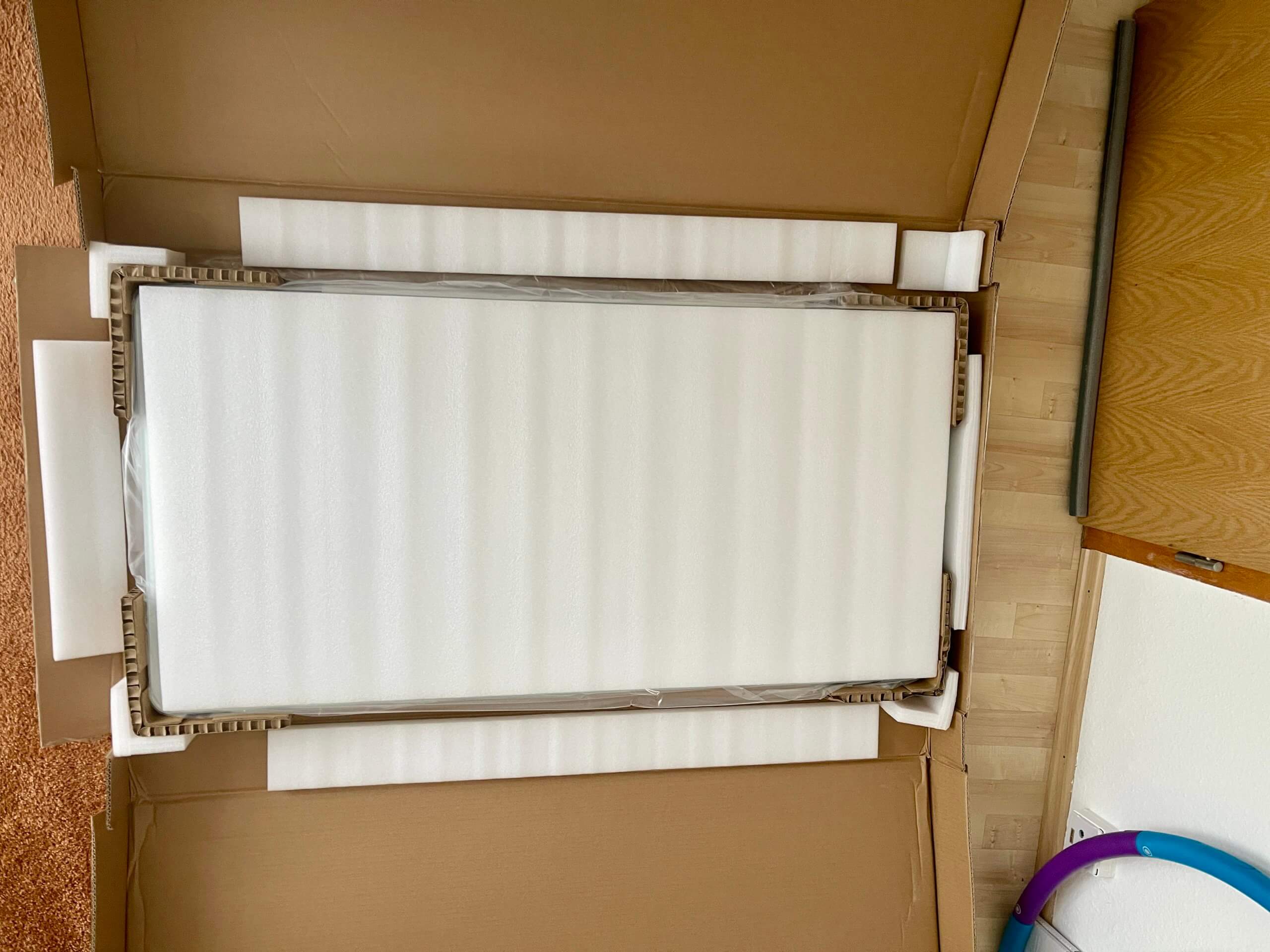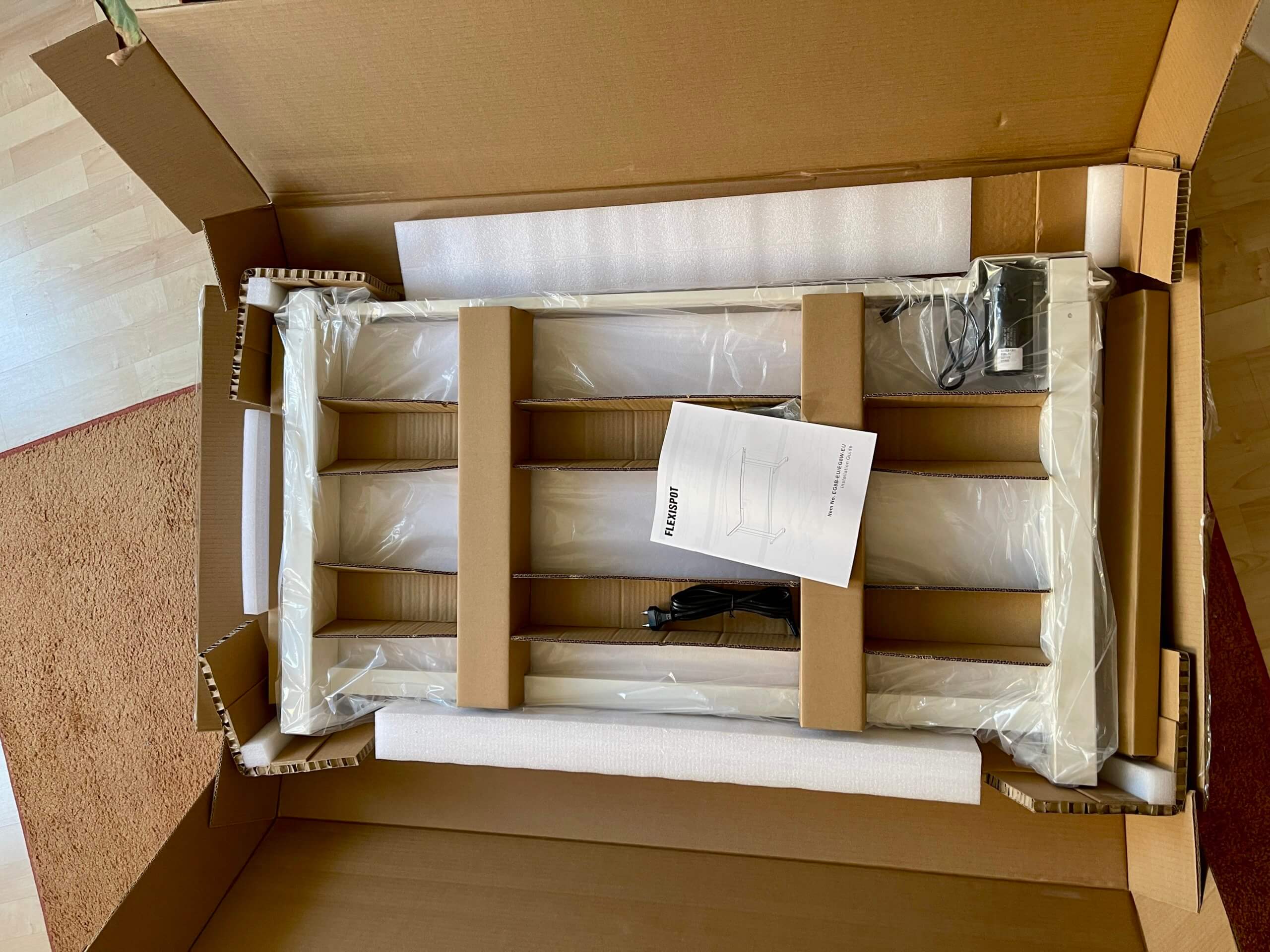 Eine kurze Beschreibung des Unternehmens ist das Eine, doch wie sieht es tatsächlich in der Praxis aus? Um diese Frage beantworten zu können, haben wir den FlexiSpot EG8 mitsamt einer weißen Schreibtischplatte, die mit einer Abdeckung aus Glas versehen ist, kostenfrei zur Verfügung gestellt bekommen und wollen unseren kurzen Ersteindruck mit euch teilen. Der Schreibtisch wurde in zwei Paketen, einmal mit DHL und einmal mit GLS, geliefert und zwar ohne Aufpreis. Das ist überraschend, da die Füße und die Tischplatte eine gewisse Größe und Gewicht haben und somit tendenziell eher als Sperrgut gelten. In der Kartonage war alles ordentlich und vor allem sicher verstaut: