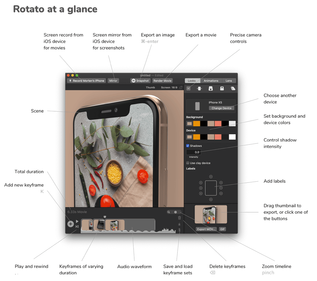 Eine solche Anwendung ist Rotato. Wie der Name schon vermuten lässt, ‚dreht‘ sich bei diesem Tool alles um bewegte Animationen verschiedener Devices, darunter iPhone, Apple Watch und Android-Phones. Mit Rotato soll es möglich sein, in nur wenigen Sekunden eindrucksvolle Mockups (als Bild- und Videodateien) zu kreieren. Deshalb stelle ich Euch die App und eine Auswahl der Funktionen vor.
