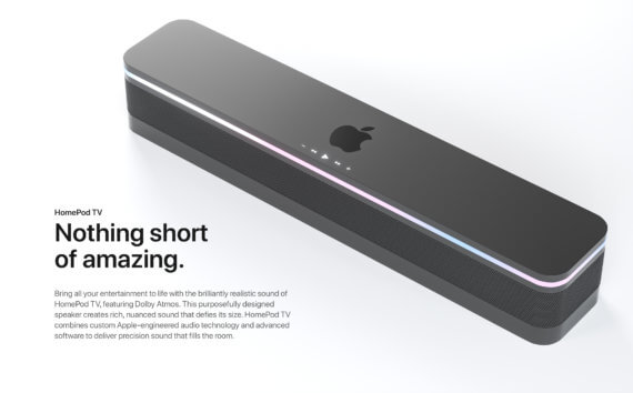Das erste Konzept besteht darin, dass es einen Premium-HomePod darstellt, der gleichzeitig als Apple TV fungiert. Damit sähe dieser aus wie eine Soundbar, die heutzutage oftmals für Premium-Fernseher genutzt wird.
