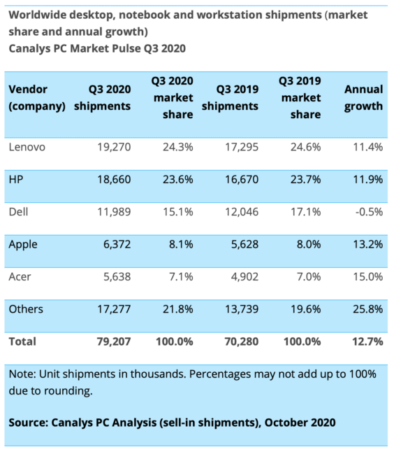 Insgesamt wuchs der Markt für PCs zuletzt um rund 12,7%. Es wurden in Q3 2020 etwa 79,2 Millionen Rechner weltweit verkauft.
