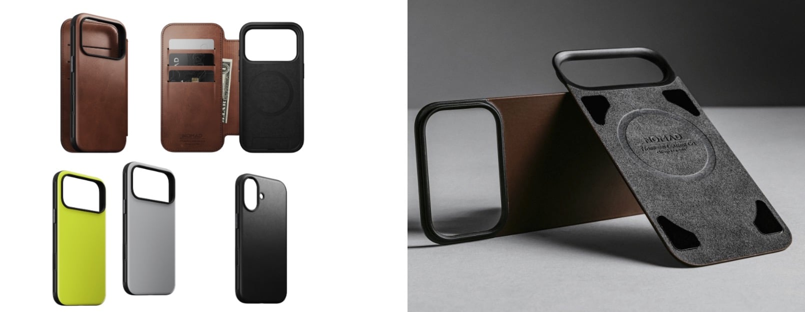 Alle Modelle sind MagSafe- und Qi2-kompatibel, verfügen über stoßdämpfende Rahmen, Mikrofaser-Innenfutter, präzise Aluminium-Tasten sowie einen reaktionsstarken Glas-Button für die Kamera. Je nach Modell stehen zwei Lederqualitäten zur Wahl: pflanzlich gegerbtes Horween-Leder mit natürlicher Patina-Entwicklung oder Nomads hauseigenes Glattleder mit konsistentem Finish.