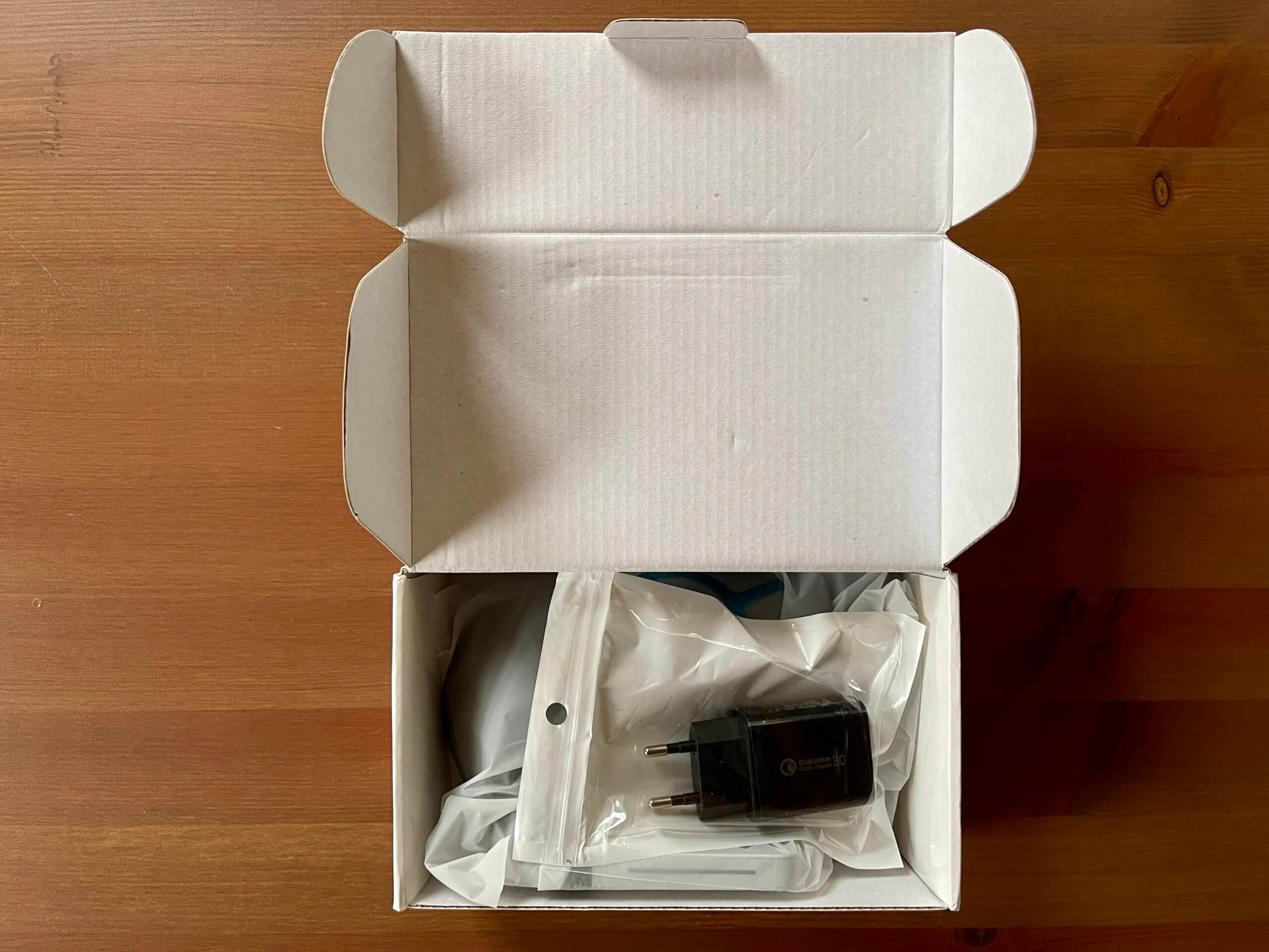 Der Wave Charge in der Farbe Schwarz mit silbernem Standfuß kommt in einer Kartonage daher, die etwas lieblos, aber nachhaltig gestaltet ist. Zumindest verzichtet der Hersteller auf Plastikfolie: Genau schnörkellos geht es im Inneren zu: neben dem Charger ist noch ein Netzteil sowie ein USB-C-Charger mit Qualcomms Quick Charge 3.0 enthalten.
