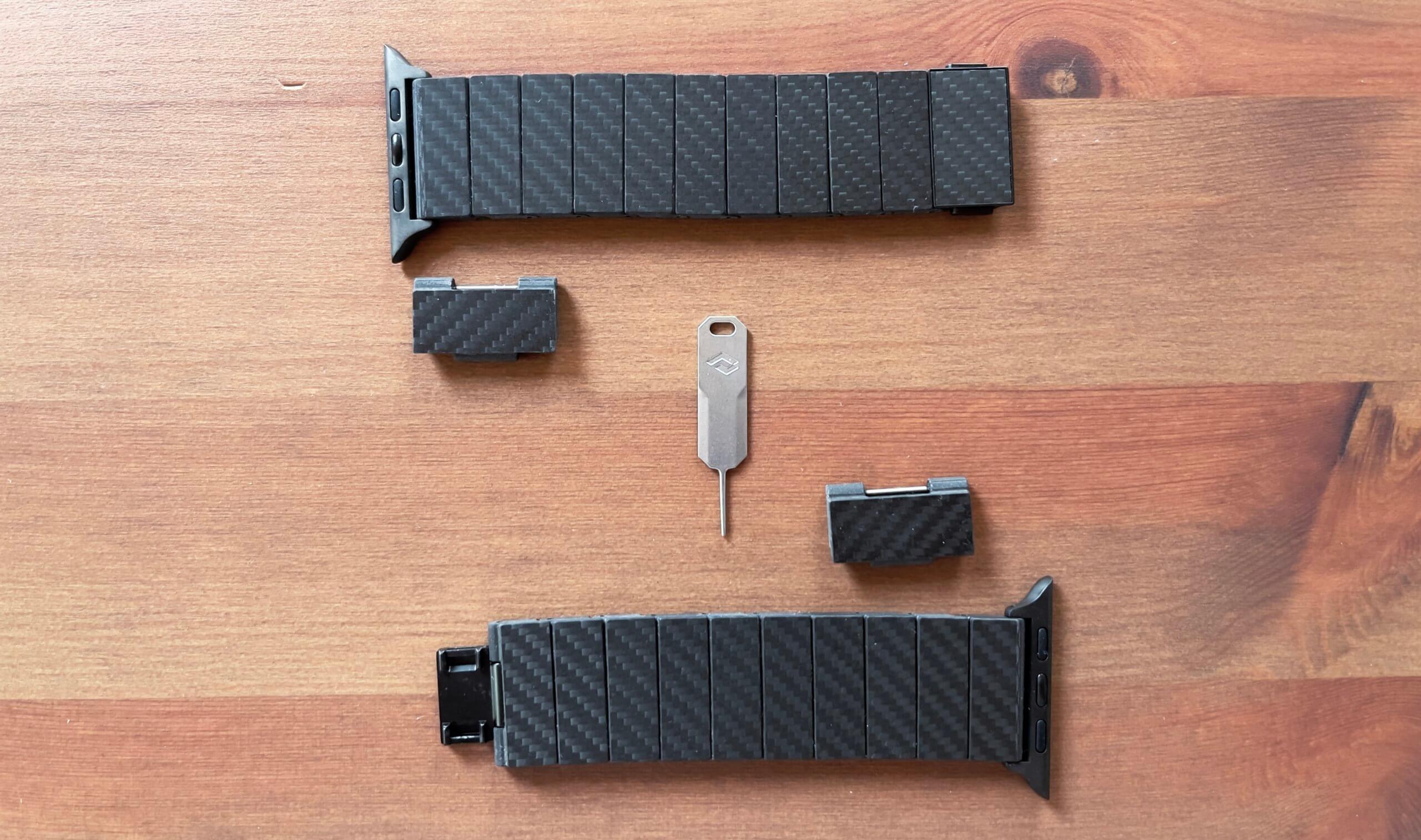 Eine schöne Verpackung ist das A und O, denn es macht Lust auf den Inhalt und Pitaka lässt sich nicht lumpen und setzt auf eine hochwertige Kartonage. Nach dem Brechen des Siegels zieht man den Inhalt einfach hervor und man wird direkt vom Armband begrüßt. Dazu gesellen sich zwei zusätzliche Glieder zum Vergrößern des Armbands sowie ein Stift zum Herausdrücken der Stifte – welcher eine gewisse Ähnlichkeit mit denen von früheren iPhone-Modellen hat.