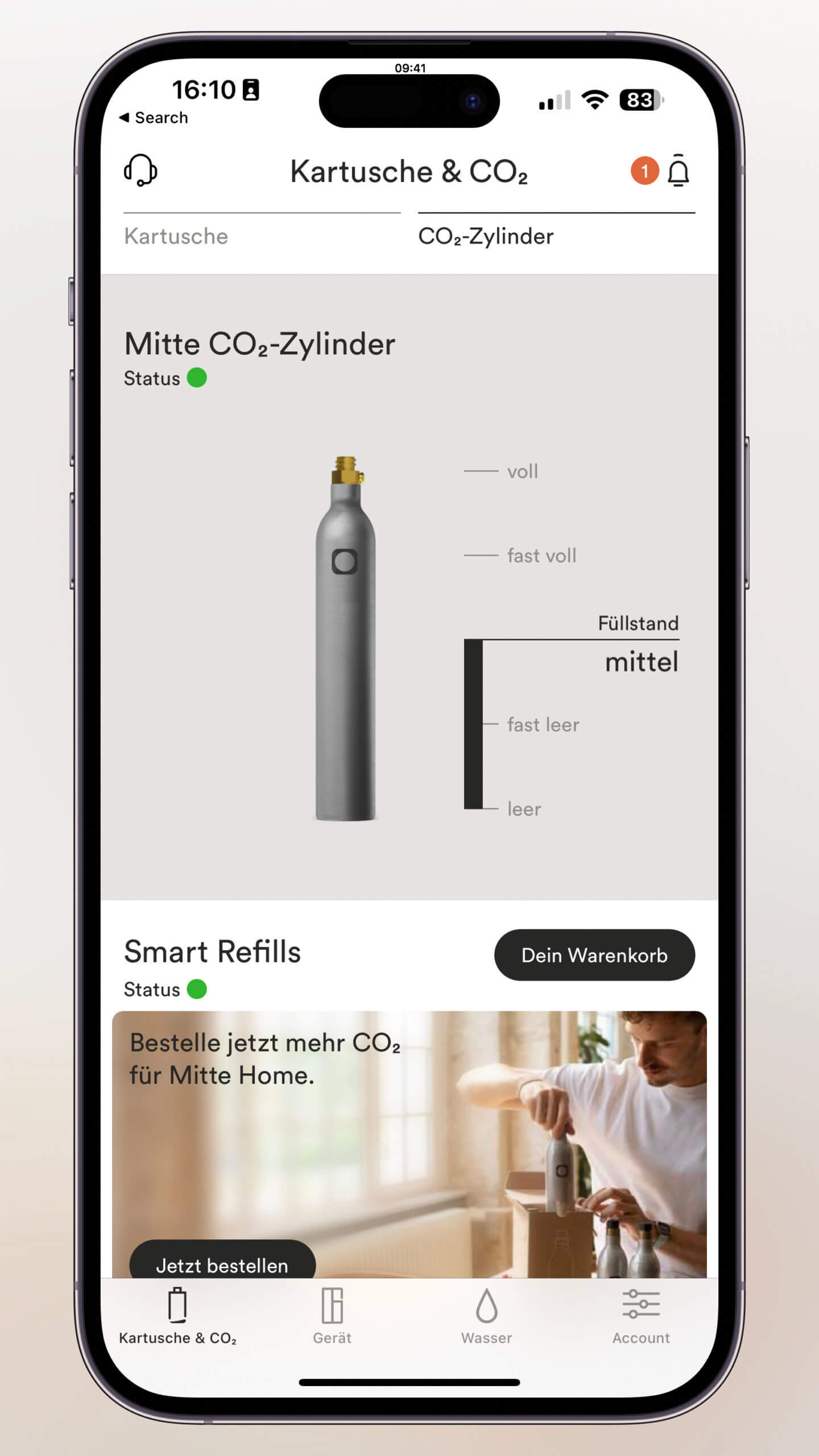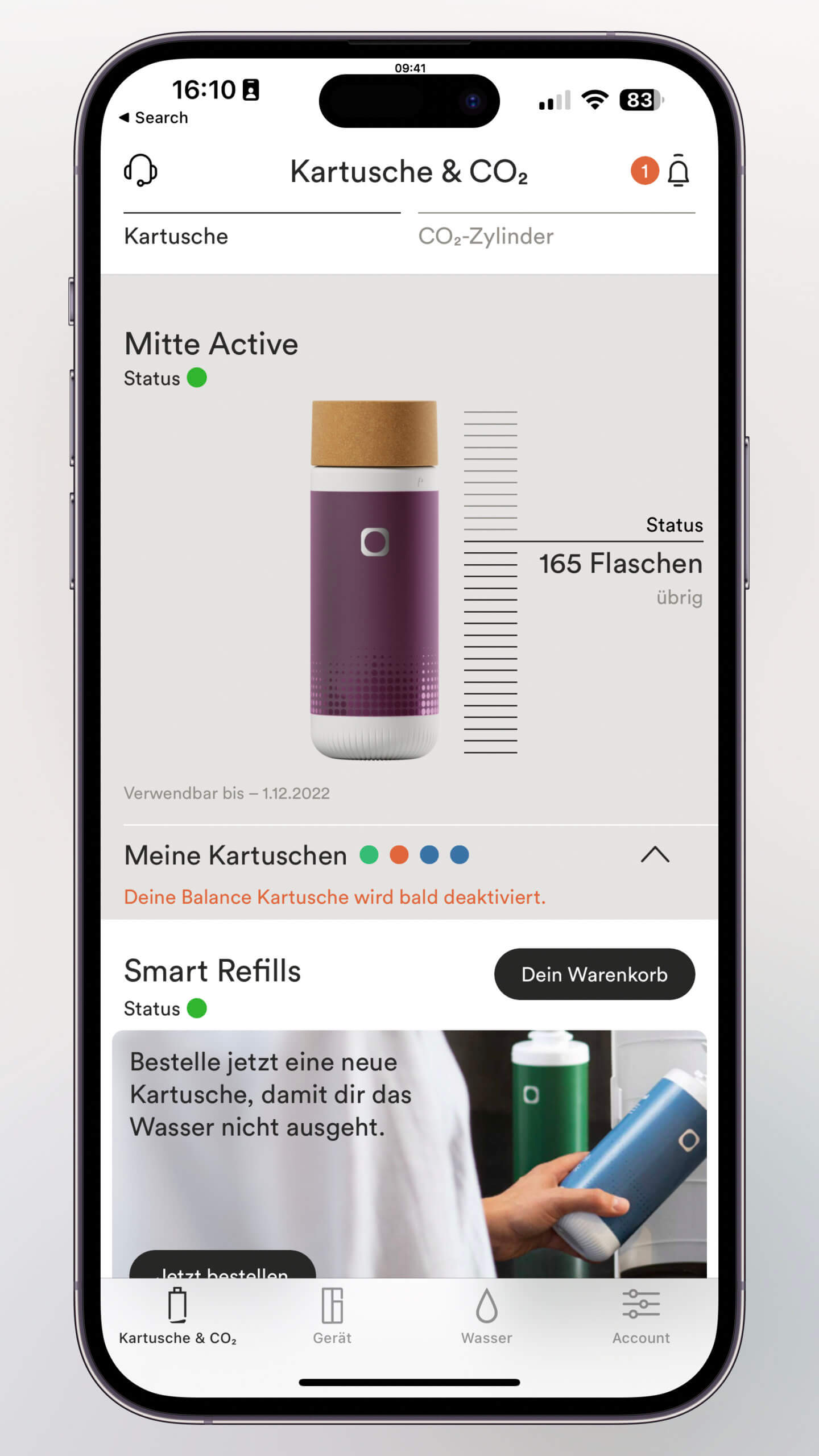 Der 3-in-1 Wasseraufbereiter kommt mit einer App, die mehr als nur schmückendes Beiwerk ist. Sie informiert darüber, wie voll die Kartusche oder der CO2-Zylinder ist oder wann eine Nachbestellung erforderlich ist.