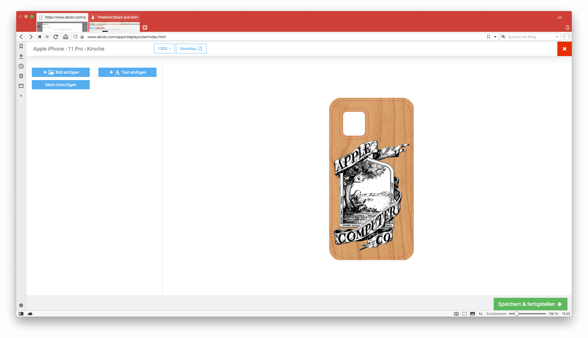 Letztlich könnt Ihr noch Eure eigenen Motive hochladen und für Euer Design verwenden. An sich eignen sich hier alle möglichen Abbildungen und Darstellungen, allerdings gibt es eine Sache zu beachten: Da es sich um Gravierungen handelt, können keine Farben wiedergegeben werden. Euer präferiertes Motiv muss also in Graustufen konvertiert werden – je dunkler die Farbe, desto tiefer wird graviert. Alternativ kann das Motiv mit dem Threshold-Effekt versehen werden. Dadurch gibt es quasi nur noch schwarze und weiße Flächen, was aber nicht für alle Abbildungen klappt. Für Threshold empfiehlt Alkoto das kostenlose Online-Tool Pinetools, natürlich geht’s auch mit Photoshop und Co.