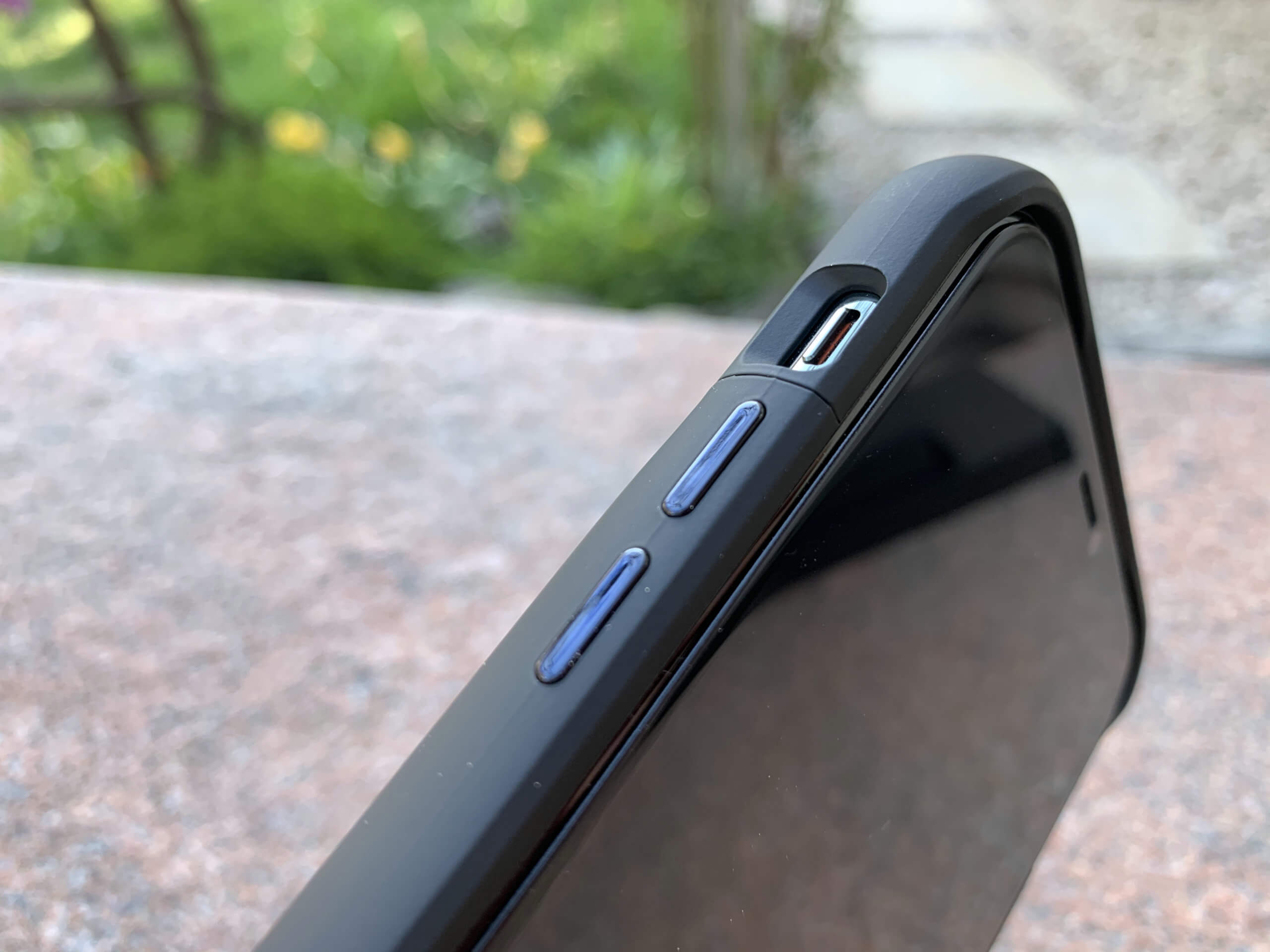 Übrigens, Thema „Access“: Dieser Name wurde nicht umsonst gewählt. Denn betrachtet man die Unterseite, wird die Differenzierung zum juice pack air und zum Smart Battery Case deutlich. Die Hülle schließt den Lightning-Port nicht ein, was bedeutet, dass er weiterhin frei zugänglich für ein Ladekabel ist. Selbstverständlich ist das ein zweischneidiges Schwert. Einerseits sind iPhone und Hülle unabhängig voneinander aufladbar und man ist im Zweifel nicht von einem Lightning-Kabel abhängig. Das USB-C-iPhone wird also Wirklichkeit. Andererseits sehen die beiden offenen Anschlüsse nicht so schön aus und die Unterseite des iPhones ist nicht geschützt. Zwar bedeutet „Access“ auch, dass das iPhone ohne Probleme an jede Docking-Station passt. Trotzdem hätte ich mir gewünscht, dass die Hülle den gesamten Handy-Rahmen umschließt.