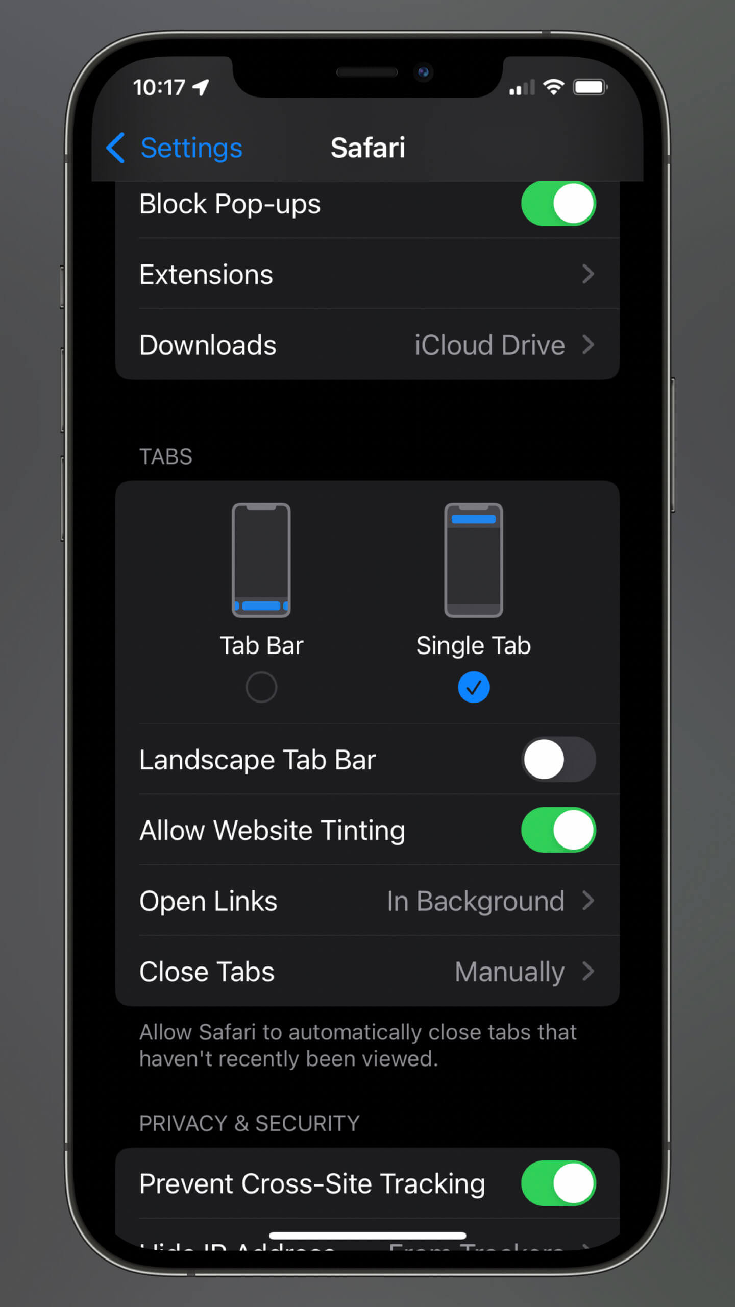 Dort könnt ihr zwischen „Tab Bar“ und „Single Tab“ wählen. Letzteres ist das alte Design. Selbstverständlich könnt ihr mit der oben genannten Einstellung auch jederzeit die Tab Bar wieder einblenden lassen