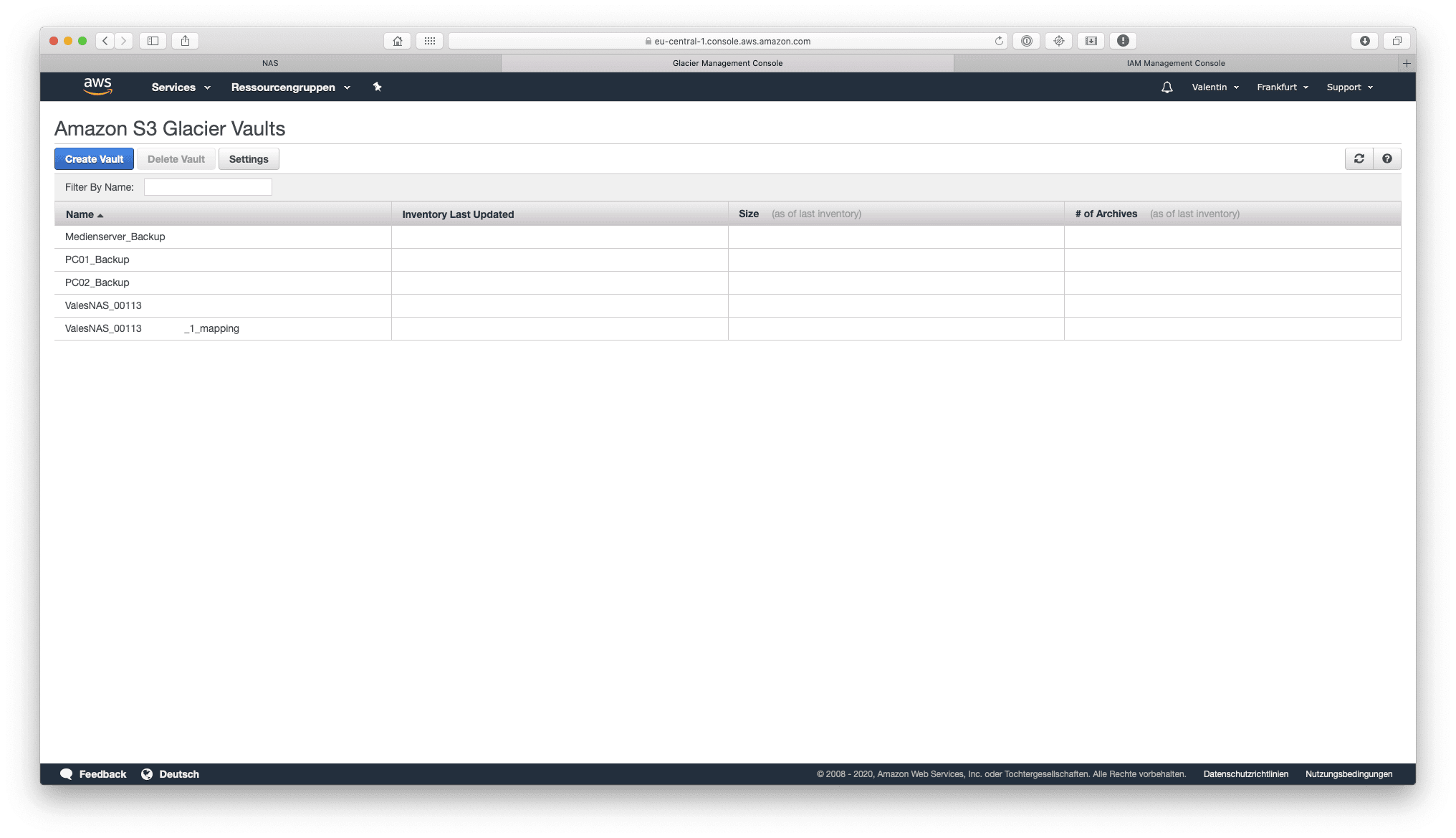 Bevor Ihr Glacier Backup nutzen könnt, braucht Ihr selbstverständlich ein AWS-Konto, welches innerhalb weniger Minuten erstellt ist. Habt Ihr alles für Glacier eingerichtet, werden in der Glacier Management Console Eure Archivordner, so genannte Vaults, angezeigt. In genau solchen wird später das Backup des NAS abgelegt sein.