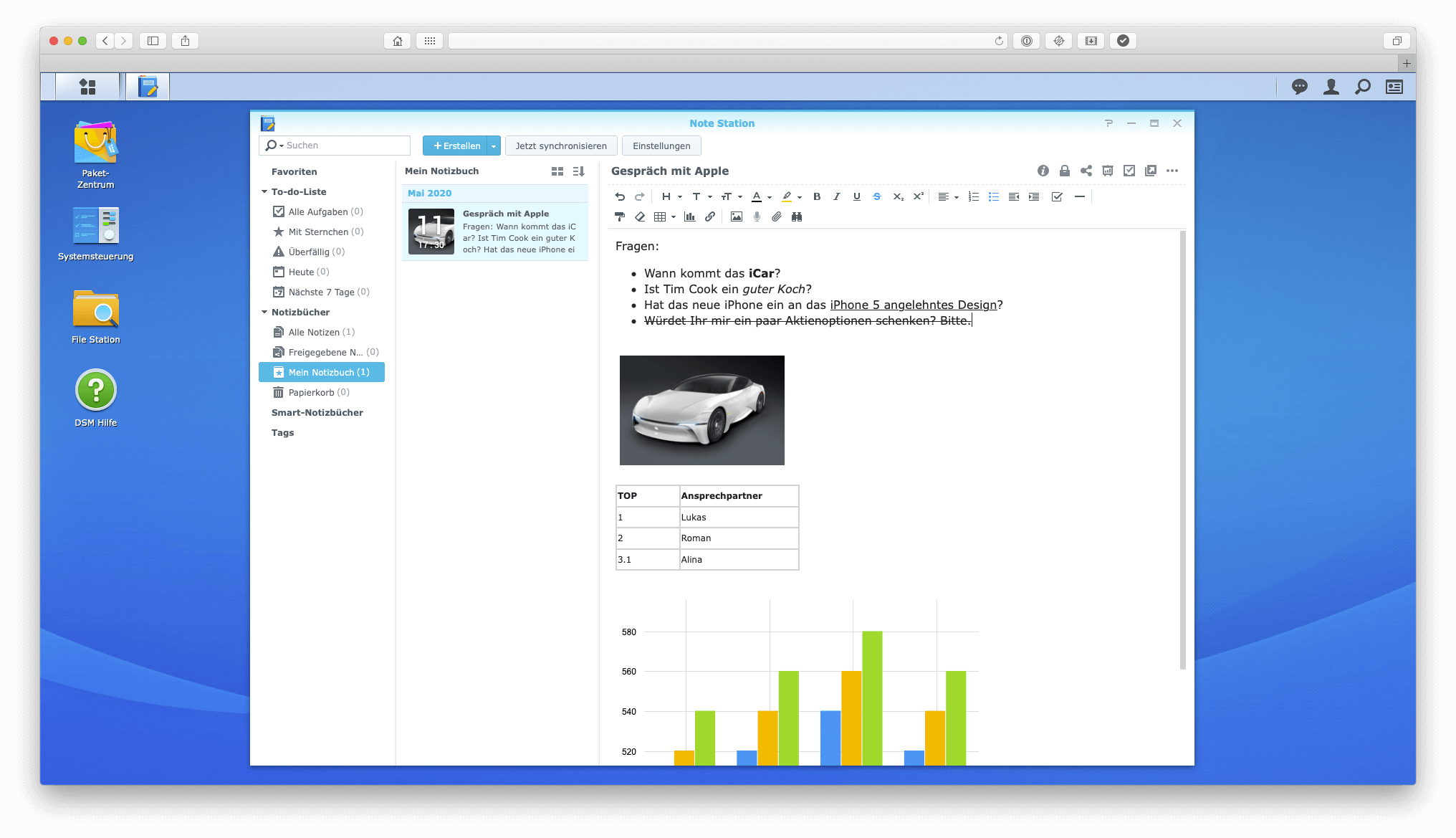 Dieses Package der Collaboration Suite vereint To-Do-Liste mit Notizbuch und ist für mich ein Apple-Microsoft-Hybrid. Denn der Aufbau erinnert mich stark an die Spaltenansicht der Notizen- bzw. Erinnerungen-App aus Cupertino. Wiederum sind die Funktionen der Note Station vergleichbar mit OneNote.