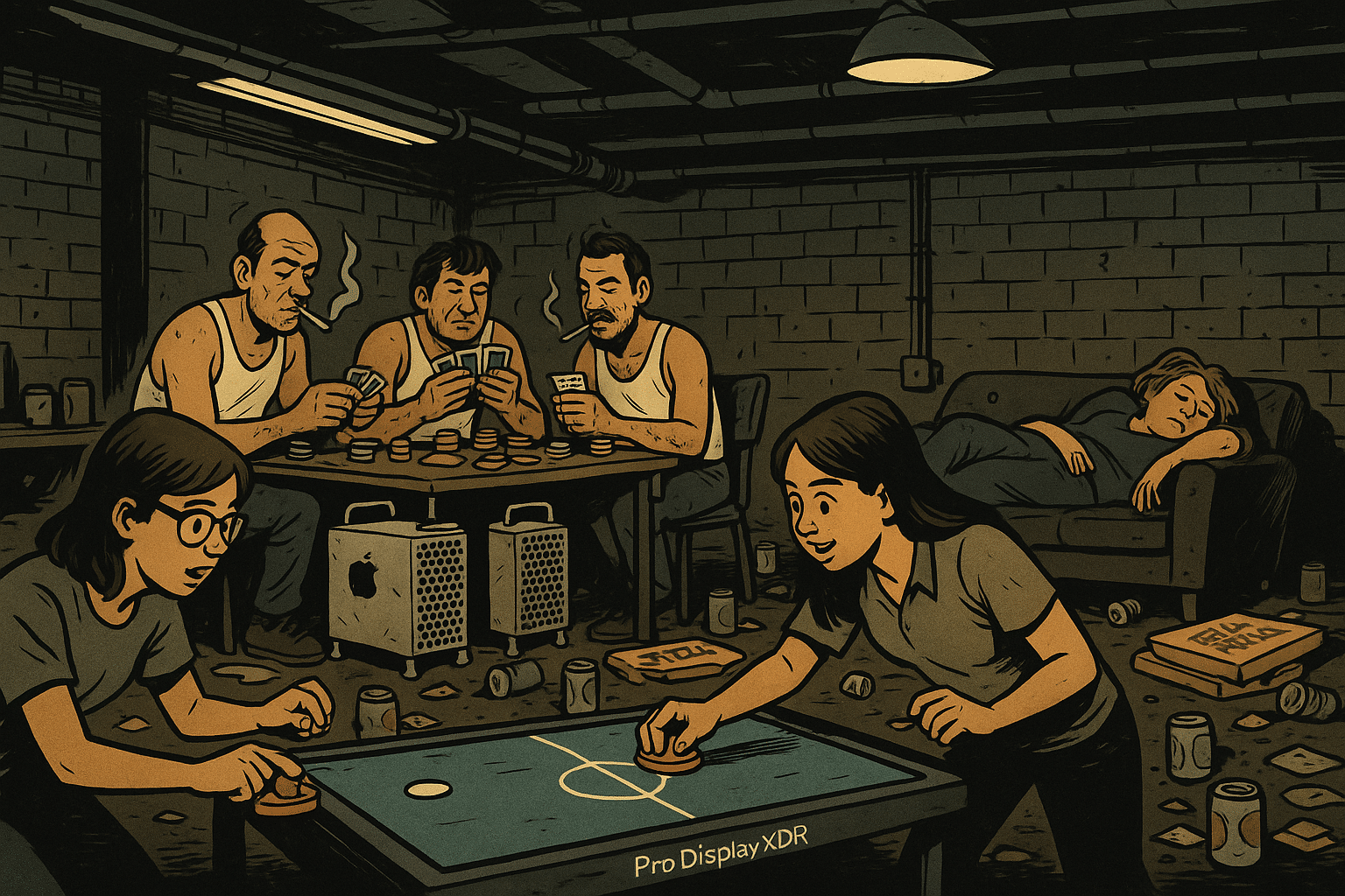 In der Kreativ-Abteilung mitten im Apple-Park. Es geht auf den Feierabend zu. Seit dem Ausscheiden von Jony Ive hat sich eine gewisse Lässigkeit in der Abteilung breit gemacht und das Gefühl, weder gebraucht noch gehört zu werden. Dementsprechend sind die Sitten: In der Ecke sitzen drei Männer (Kreative 1 bis 3) in Unterhemden, Zigaretten im Mundwinkel und spielen Poker auf einer Magnettafel, quer auf vier Mac Pros liegend, eine Kreative (4) steht und telefoniert lautstark gestikulierend mit ihrem Freund, der seit kurzem bei Meta arbeitet. Das Großraumbüro ist übersät mit Pizzakartons, leeren Bierdosen und Uber-Eats-Verpackungen. Die Chefin liegt auf einer Ikea-Couch und döst vor sich hin, unterbrochen von Wutausbrüchen, bei denen sie gelegentlich das Wort „Plateau“ wie eine Furie ausspuckt. Zwei junge, engagierte, motivierte Kreative (5 und 6) spielen Air-Hockey auf einem flach liegenden Pro Display XDR mit den Glasmodellen, die das Marketing für das Liquid-Glass-Video bei Fielmann gekauft hatte. Der Chef Tim und Emily, wichtigste Praktikantin mit Protokollpflichten, kommen herein.